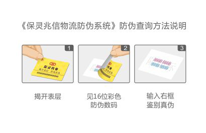 請輸入您所要查詢保靈產品的16位彩色防偽碼,從左到右依次全部輸入(先輸完上排再輸下排)揭開黃色標簽獲取。